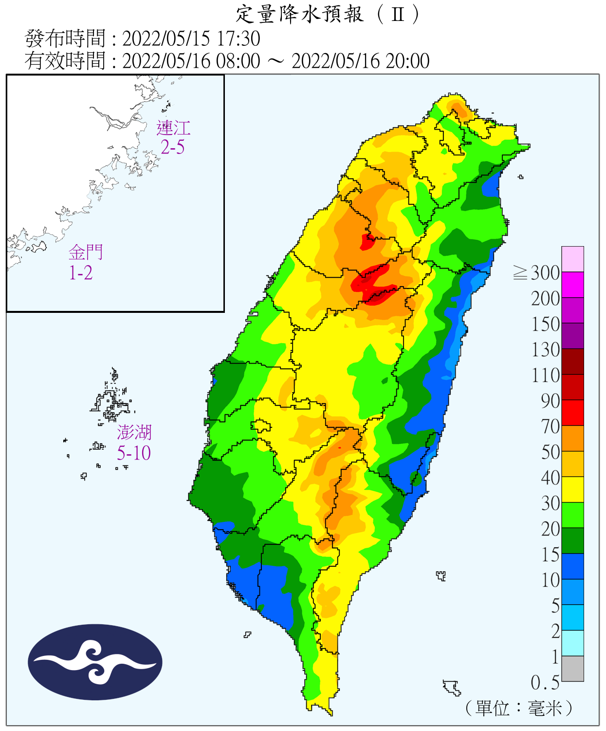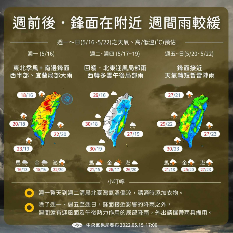 氣象局說明,下週一(16日)鋒面雖然來到巴士海峽,不過鋒後的雲帶持續在臺灣上空,水氣偏多,各地容易下雨,降雨有機會較為持續且西半部山區有局部大雨發生的機率;東北季風來到最強,各地天氣較涼甚至有點冷,北部及東北部整天溫度介於16到19度,其他地方早晚低溫18到20度,白天高溫21到24度。