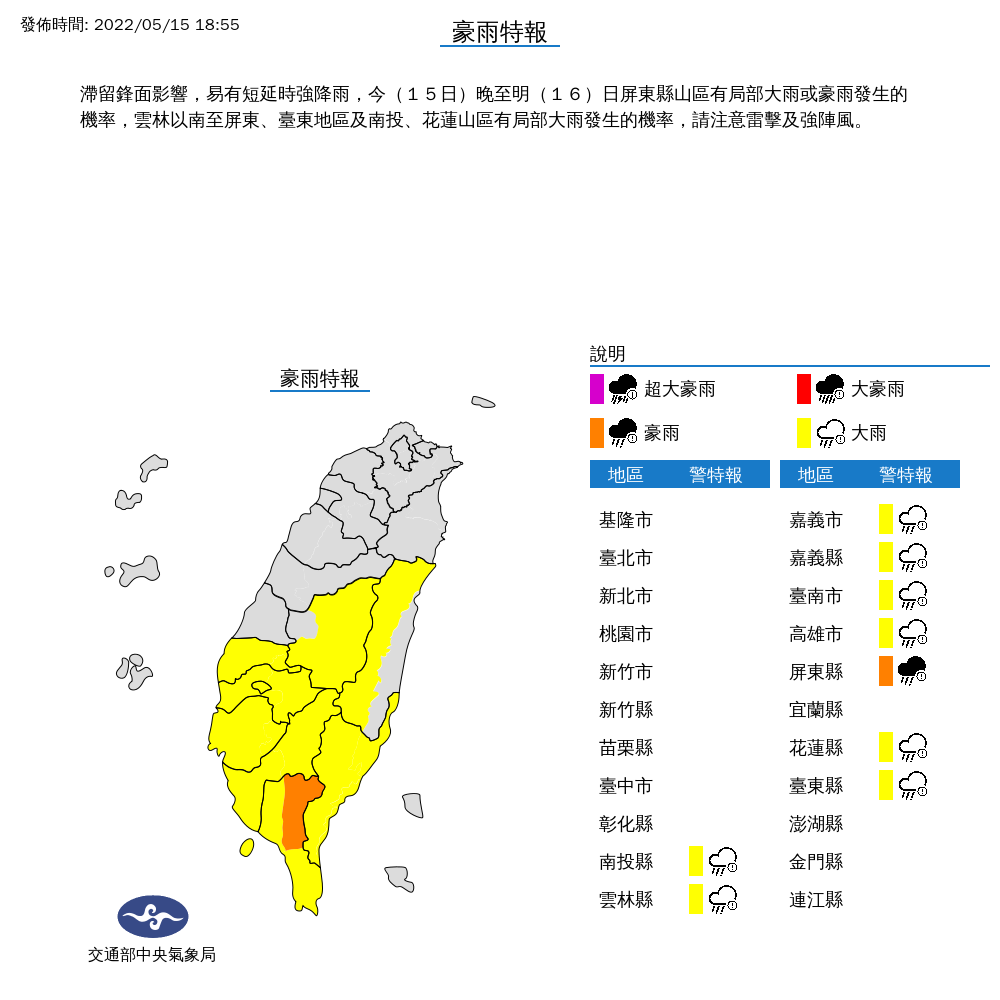 今天(15日)鋒面位於巴士海峽,水氣偏多,白天南部地區有陣雨,其他地區有局部短暫陣雨。氣象局表示,今晚起至明日將有另一波水氣移進臺灣上空,雨勢再轉明顯且持續,西半部及東北部地區有陣雨或雷雨,並有局部大雨發生的機率,夜晚低溫則會降到17、18度,其他地區早晚也較涼。