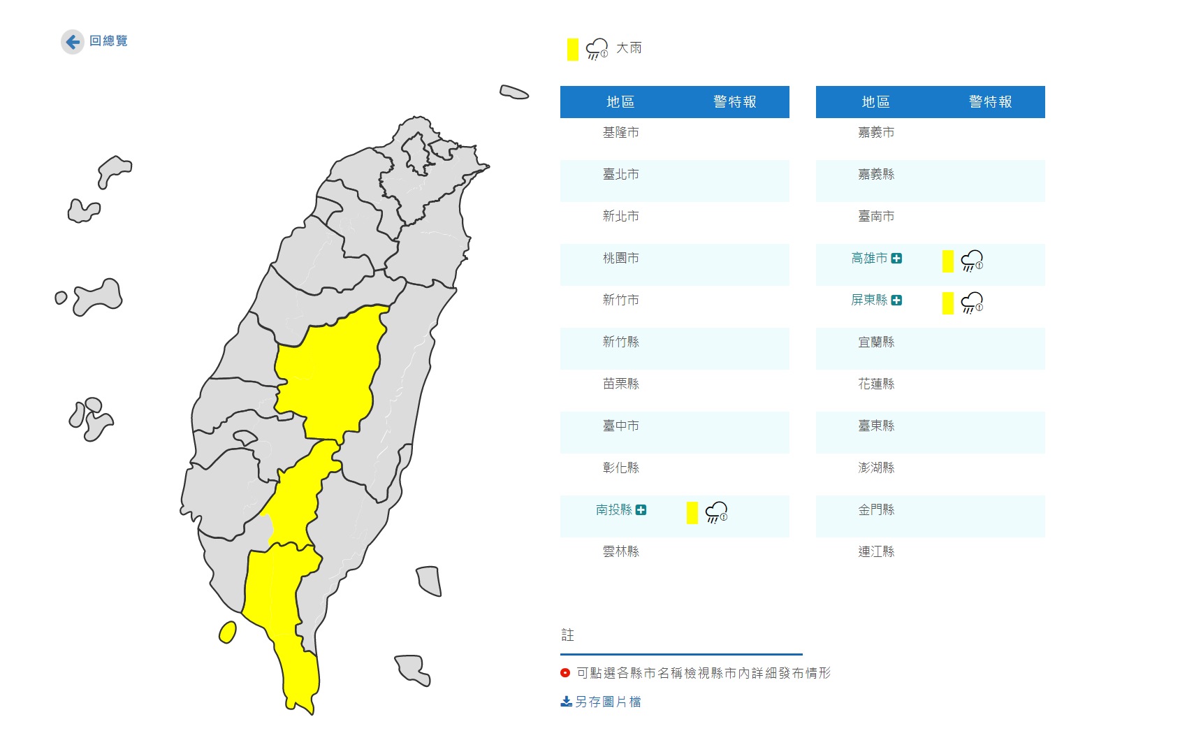 中央氣象局指出,由於午後對流雲系發展旺盛,易有短延時強降雨,因此特別針對南投縣、高雄市、屏東縣等三個地區,發布大雨特報,並指出可能出現雷擊、強陣風及溪水暴漲等情況。