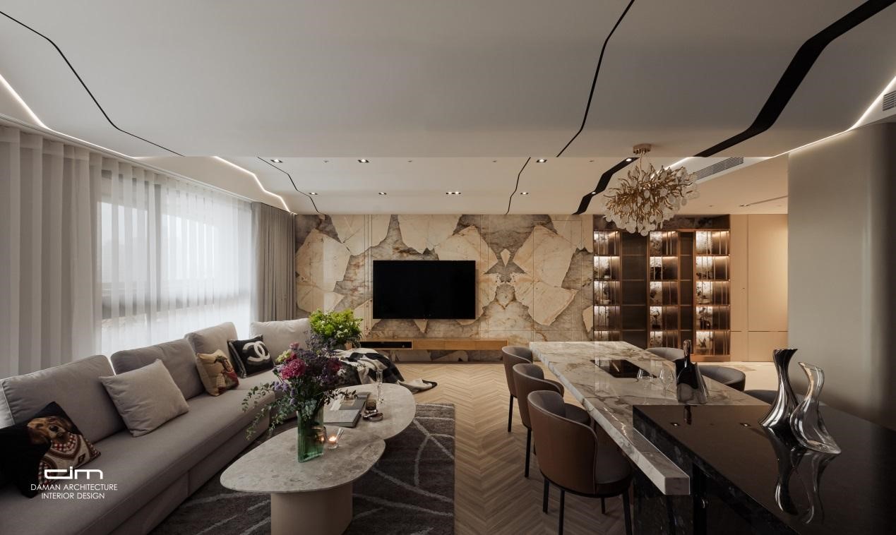 走進玄關耀眼的鍍鈦金屬線條與石材結合,優雅精緻的奢華卻不失一絲溫暖。客製化的鍍鈦金屬展示櫃緩緩點綴著一大片醒目亮眼的奢石,電視牆面的石材拼花散發出靜謐安好的雅緻,特別一提的是,此案件為兩戶打通的格局客廳上方有一根梁柱,設計師索性將整體空間全規劃成公領域,天花板造型優美潺潺,分割曲線雲海般的延伸翩舞與跳躍,兩側則選用燈帶巧妙相呼應,並柔順的修飾空間格局。