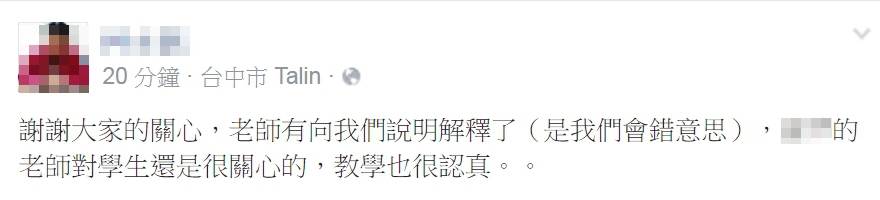 今(9日)原PO在臉書表明,是和老師間的誤會,並稱讚老師對學生的關心和教學的認真。