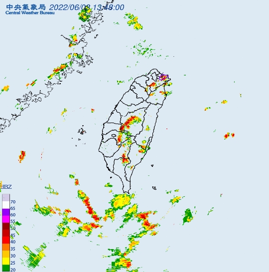 中央氣象局今天下午表示,基隆北海岸、宜蘭、南投、臺東地區及新竹以北、雲林以南山區有局部大雨發生的機率,請注意雷擊及強陣風。大雨範圍包括基隆北海岸、新北市山區、桃園市山區、新竹縣山區、南投縣、雲林縣山區、嘉義縣山區、臺南市山區、高雄市山區、屏東縣山區、宜蘭縣、臺東縣、蘭嶼綠島。