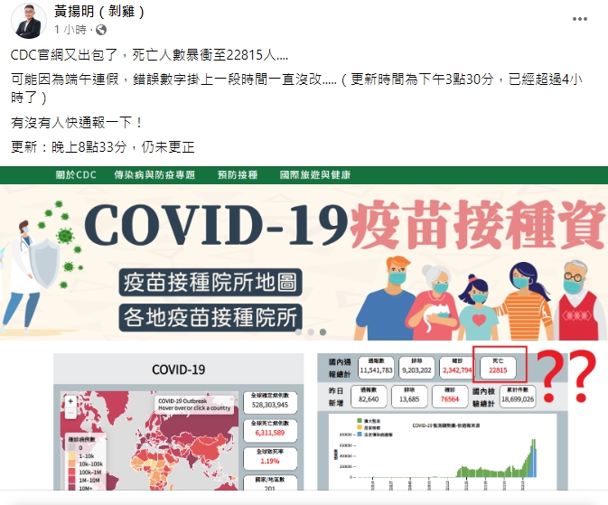 今天晚間7點多,媒體人黃揚明在臉書發文,表示CDC官網出包,下午3點30分更新資料後,誤將國內新冠肺炎死亡數,誤植為22815人,不過似乎是因為端午節連假的關係,錯誤的數字掛了好幾個小時都沒有修正,這讓他心急表示「有沒有人快通報一下!」