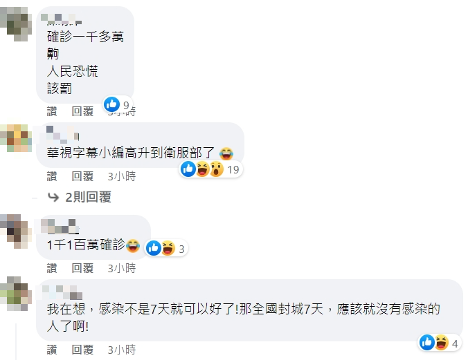 貼文曝光後不少網友也紛紛留言表示,「造成我恐慌了,不用罰嗎」、「累積確診破千萬」、「全體免疫?太多太粗暴?」、「你累了嗎?這是寫好的劇本提前公開啦!」、「散播不實謠言,根本資訊戰吧?」、「昨天全島確診,今天就好一半了,偉哉政府」、「哇已經快是台灣人口的一半了」、「可怕,竟然造謠全台破千萬人感染」、「華視來的小編嗎?」、「糟了,內鬼竟是衛福部自己,要不要罰300萬」。
