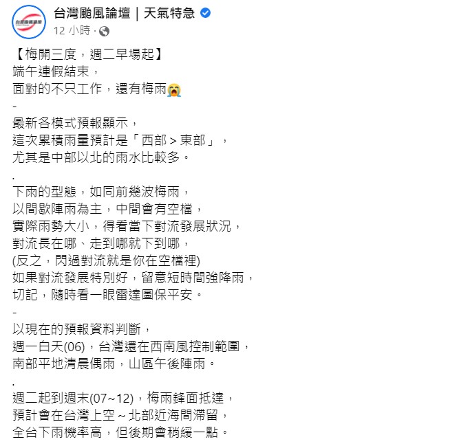 天氣特急表示,今(6)日白天,台灣還在西南風控制範圍,南部平地清晨偶雨,山區午後陣雨,至於明天開始一直到周日(12日),梅雨鋒面抵達,預計會在台灣上空到北部近海間滯留,全台下雨機率高,但後期會稍緩一點,天氣特急也指出,這次鋒面待的時間比較長,雖然雨勢不見得會大到致災的程度,但連續降雨也讓人很煩躁,民眾要多多忍耐了。