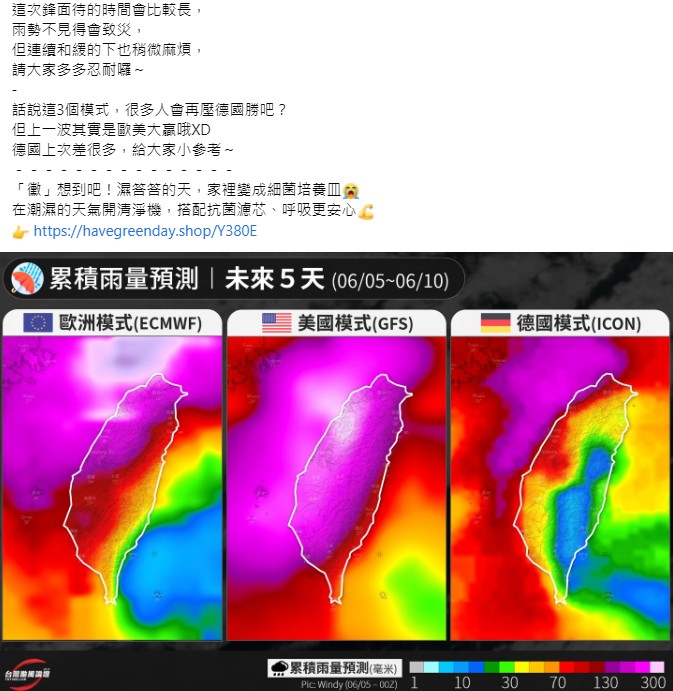 可能是有史以來最長的梅雨鋒面,將要在明天報到了!氣象粉專「台灣颱風論壇|天氣特急」貼出一張未來5天的雨量預測圖,只見全台籠罩在一片紫色中,讓人相當擔心,而雨勢分布狀況也出爐了。