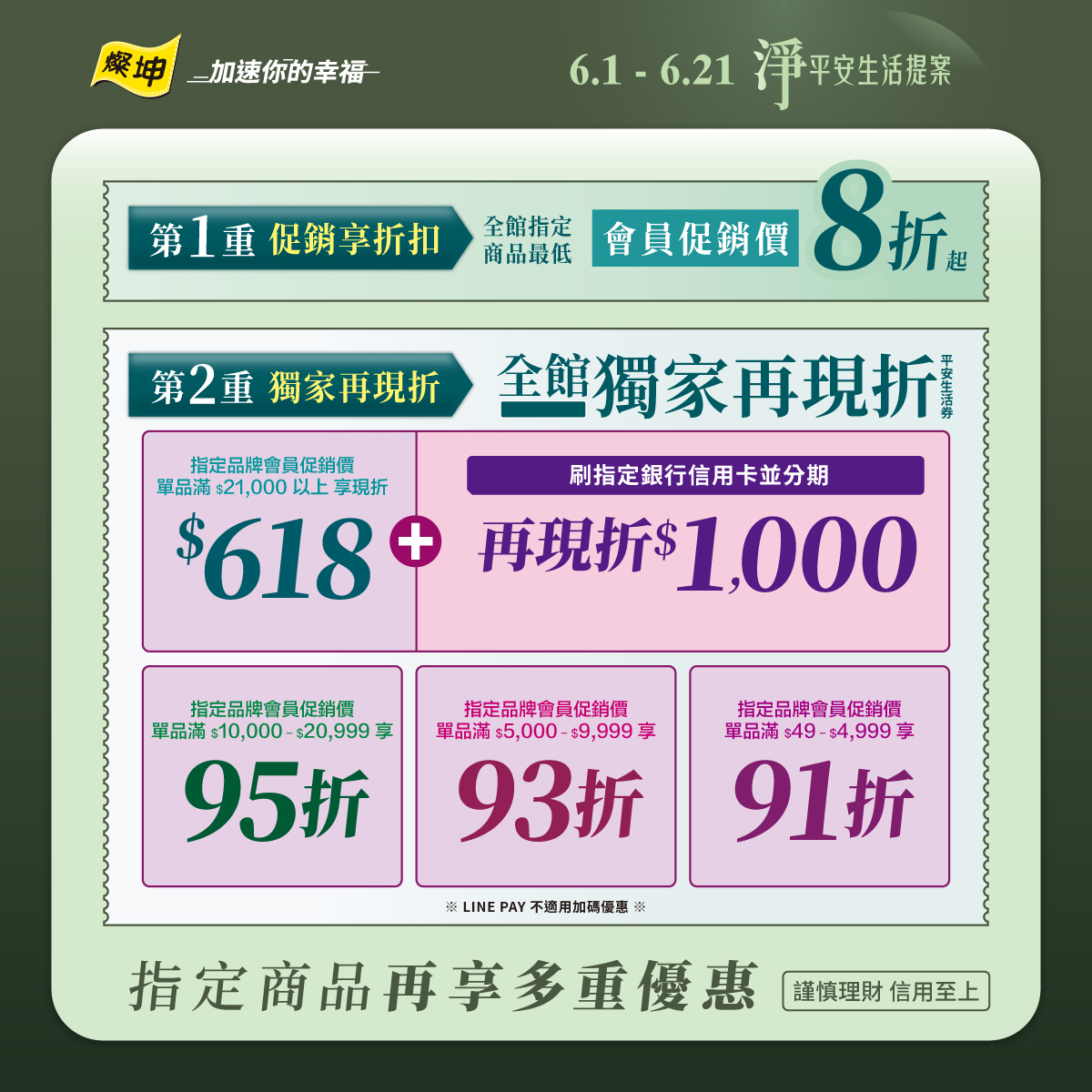 指定商品刷台新、國泰世華、永豐、玉山、花旗、中國信託、聯邦、星展、滙豐、陽信等十大銀行信用卡,滿2萬並分3/6/8期享0利率,除了享以上優惠外,還可額外再送1,000元現折券;最高現折1,618元;每位會員最多可回饋3次,累積現折金額可達4,854元!「平安生活現折券」數量有限,送完為止!