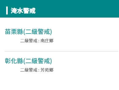 ▼水利署對彰化縣芳苑鄉、苗栗縣南庄鄉發佈二級淹水警戒。(圖/翻攝自經濟部水利署官網)