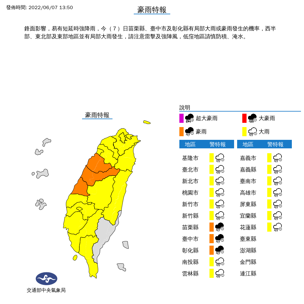 氣象局指出,今日整天斷斷續續都有下雨的情況,局部有大雨甚至短延時豪雨發生的機率,請注意雷擊及強陣風,低窪地區請慎防積、淹水的情形,民眾出門在外請注意安全,而苗栗縣、台中市、彰化縣都有局部大雨或豪雨發生的機率,其餘基隆市、台北市、新北市、桃園市、新竹市、新竹縣、南投縣、雲林縣、嘉義市、嘉義縣、台南市、高雄市、屏東縣、宜蘭縣、花蓮縣則是大雨特報。