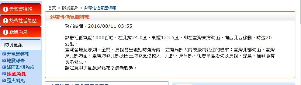 氣象局今天首度發布「熱帶性低氣壓特報」,提醒台灣各地及澎湖、金門、馬祖易出現短時強降雨,並有局部大雨或豪雨發生的機率,台灣北部、東北部海面、台灣海峽北部及巴士海峽風浪較大,本島沿海及馬祖、綠島、蘭嶼易有長浪發生,請大家特別注意。