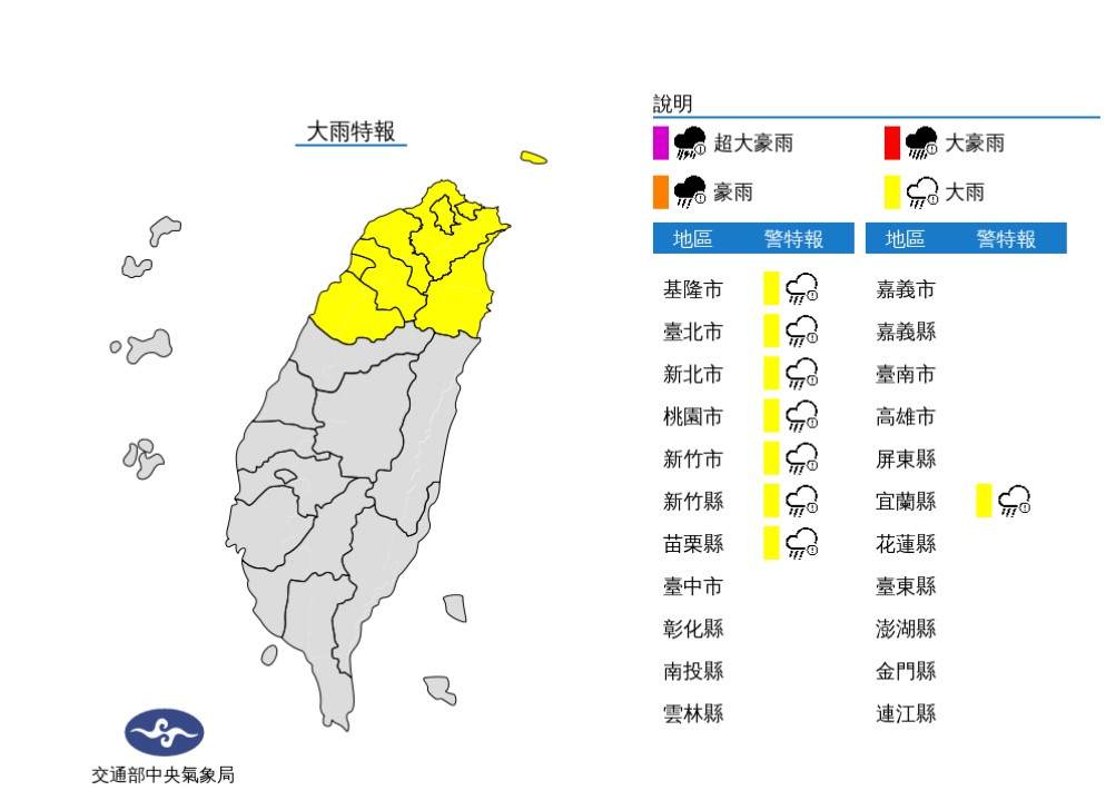 氣象局指出,今(11)日臺灣北部及東北部地區有局部大雨發生的機率,於下午16:00針對基隆市、台北市、新北市、桃園市、新竹縣、市、苗栗縣以及宜蘭縣發布大雨特報,請注意雷擊及強陣風,低窪地區請慎防積水。
