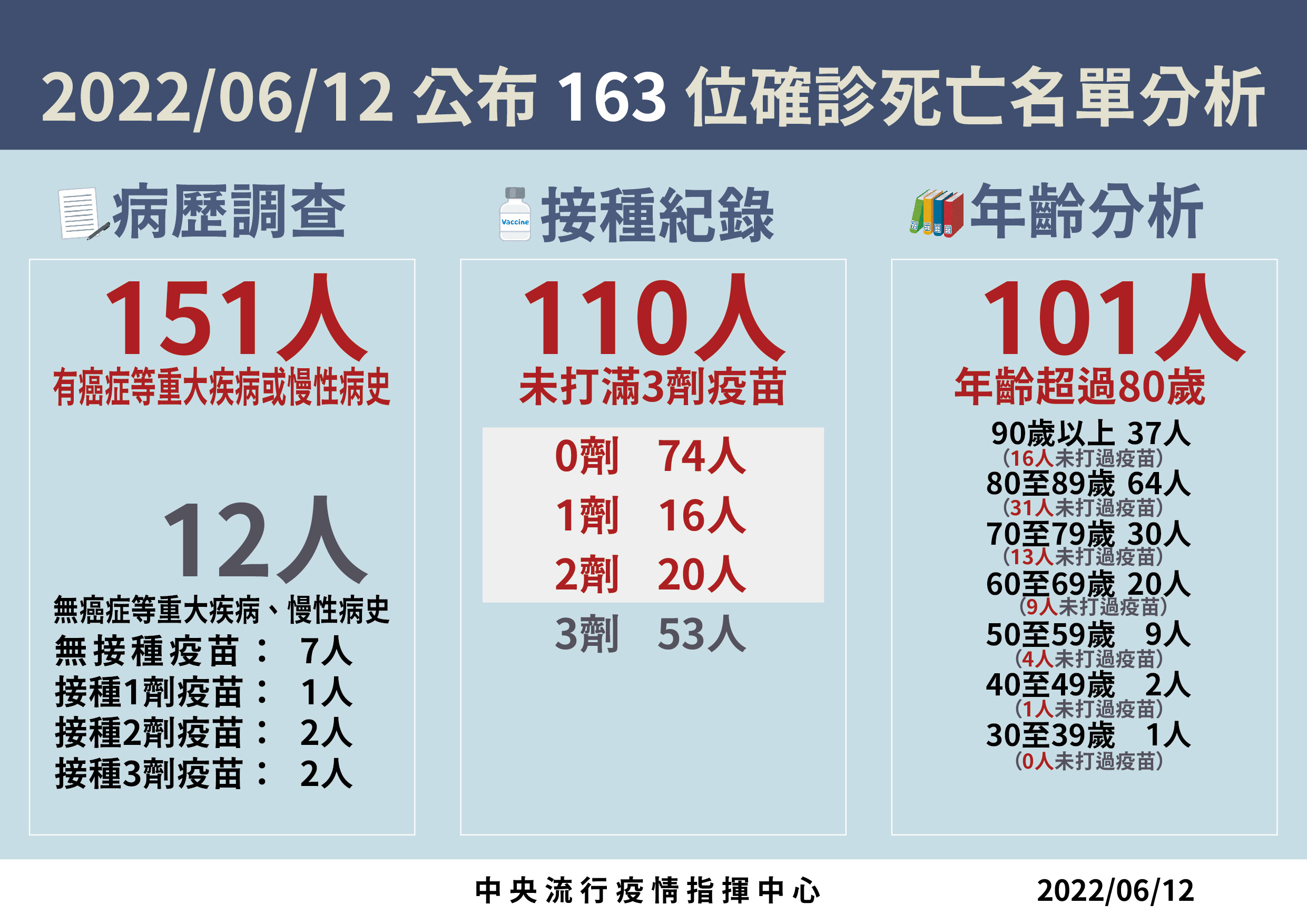 指揮中心指出,今日新增163例本土病例死亡個案,為91例男性、72例女性,年齡介於30多歲至90多歲以上,皆屬重度感染個案、151例具慢性病史、110例未接種3劑 COVID-19疫苗。確診日介於今(2022)年5月3日至6月9日,死亡日期介於5月25日至6月9日。
