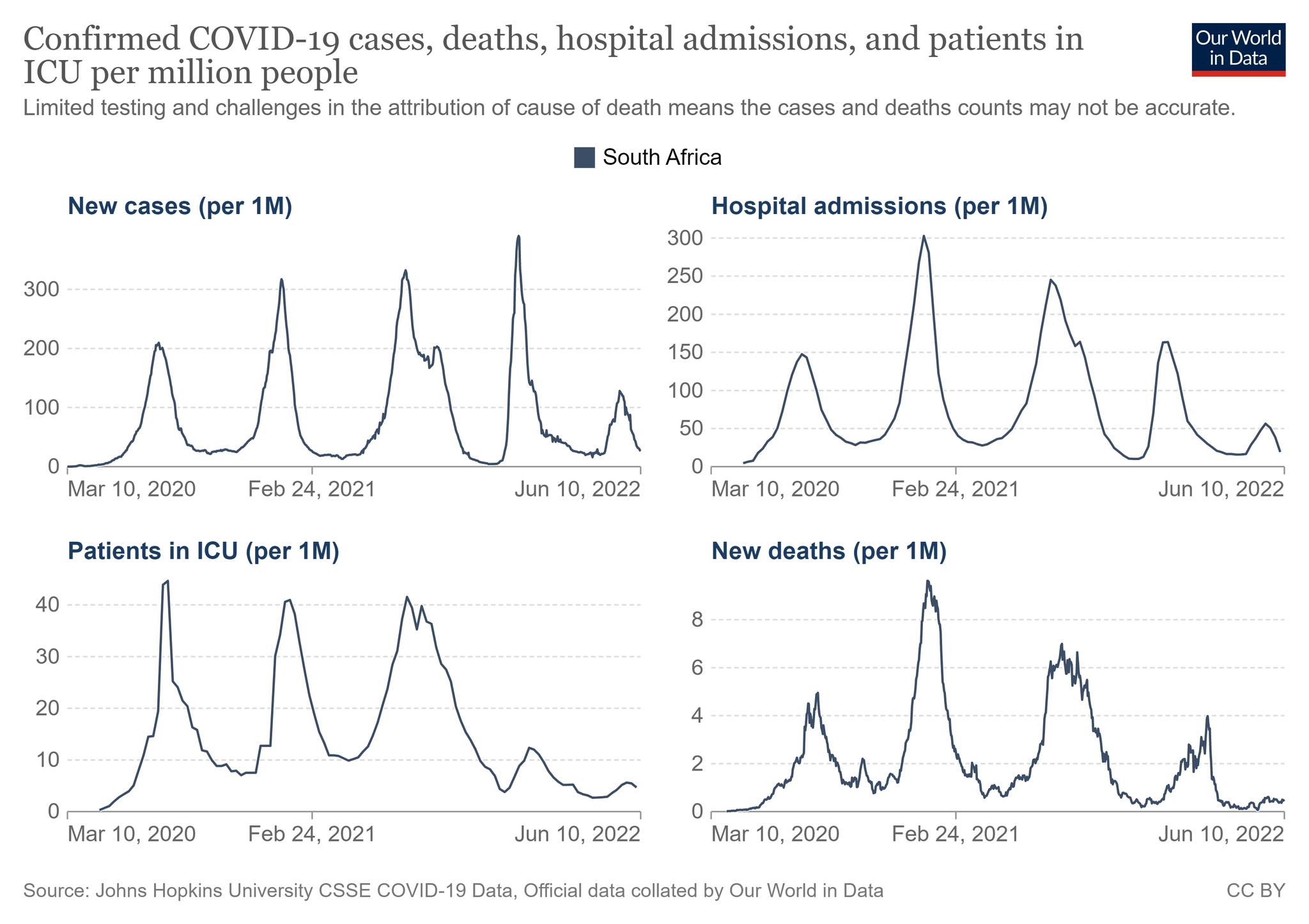 林氏璧在臉書上發文表示,很多人擔心Omicron的「表妹們」,昨(11)日新光醫院副院長洪子仁和自己討論,擔不擔心邊境改為3+4,新的變種病毒會進來,他分享一張圖表解釋「南非的BA.4、BA.5這波疫情已經結束了」,圖表右上角為新冠住院人數、左下角為加護病房住院人數,以及右下角的死亡人數波動都很有限。