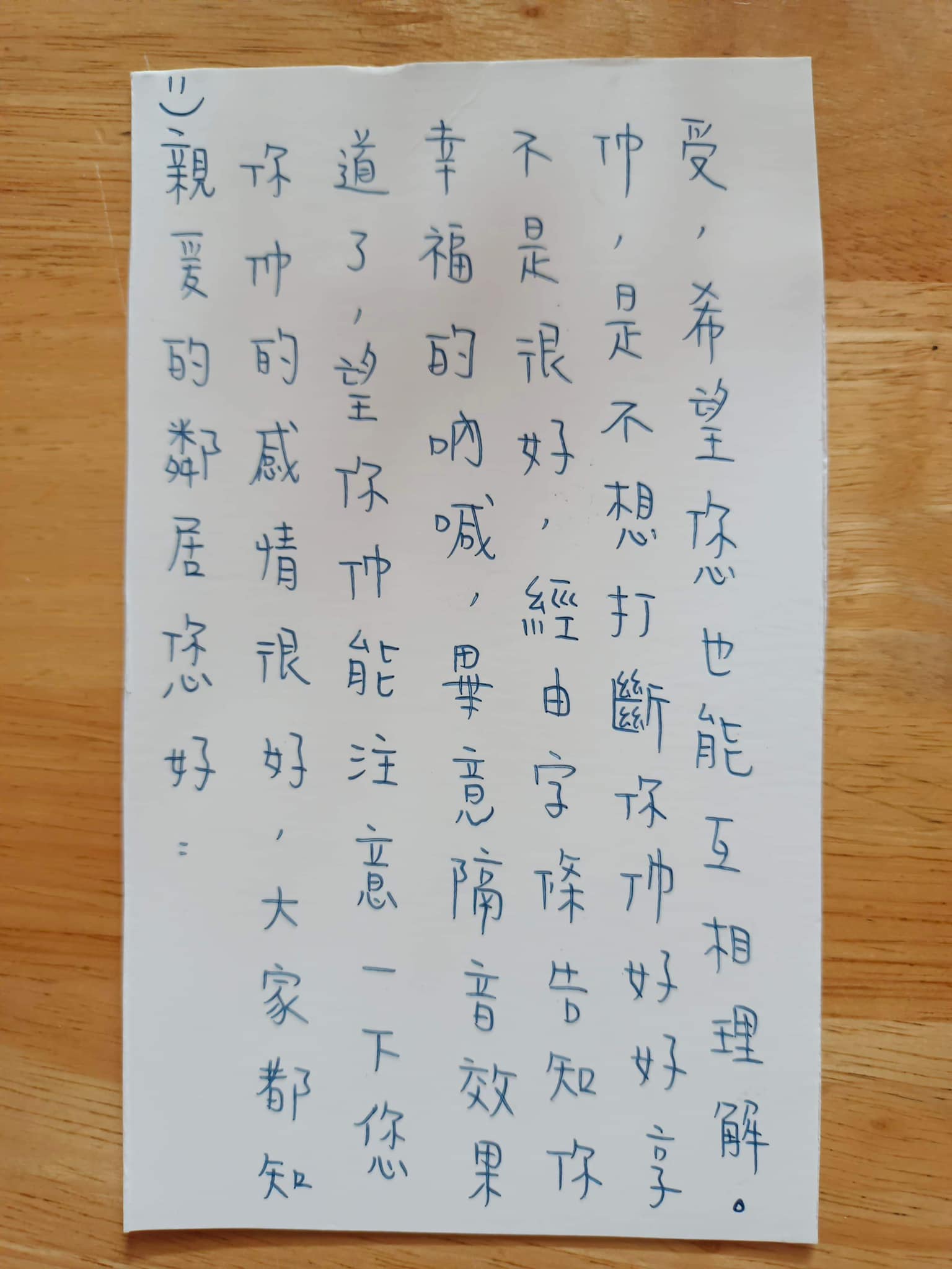 原PO妹妹在紙條內寫下,「親愛的鄰居您好:你們的感情很好,大家都知道了,(希)望你們能注意一下您幸福的吶喊,畢竟隔因效果不是很好,經由字條告知你們,是不想打斷你們好好享受,希望您也能互相理解」。原PO是後也虧妹妹,「小姐!你是不是羨慕了?」
