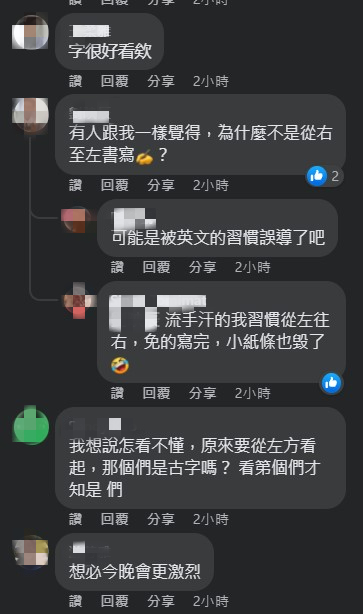 不過不少網友站完字條紛紛歪樓,稱讚原PO的妹妹字很漂亮,「字很漂亮欸!!我很喜歡欣賞字漂亮的人」、「這個字先打100分」、「字也太漂亮、如果是我寫的話、對方應該只會火大...」。另外還有網友困惑原PO妹妹書寫順序是否有誤,「有人跟我一樣覺得,為什麼不是從右至左書寫?」、「我想說怎看不懂,原來要從左方看起」、「書寫方向錯了」。