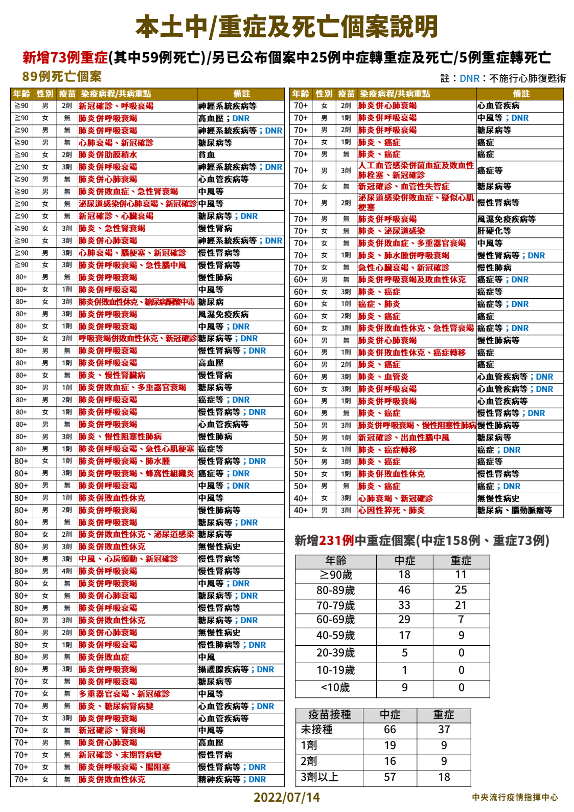 指揮中心指出,今日新增89例本土病例死亡個案,為48例男性、41例女性,年齡介於40多歲至90多歲以上,皆屬重度感染個案、86例具慢性病史、64例未接種3劑 COVID-19疫苗。確診日介於今(2022)年5月6日至7月11日,死亡日期介於5月6日至7月11日。其中死亡個案有一名40多歲女性,本身無慢性病、打三劑疫苗,在7月10日就寢後,於凌晨發現沒有呼吸心跳緊急送醫,快篩與PCR皆陽性,Ct值21.4,急救無效死亡過世,死因認定為心肺衰竭、新冠確診。