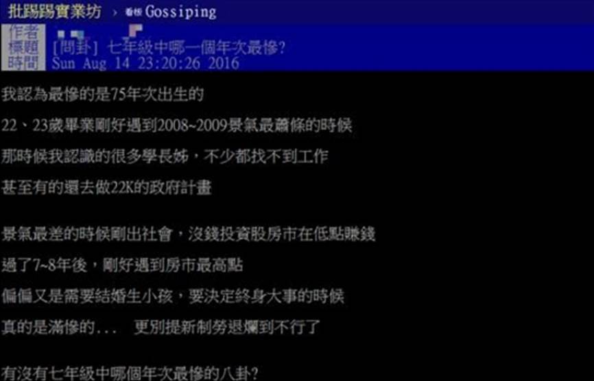 房價現象,連帶影響了結婚率和出生率。一名網友,近日就在批踢踢PO文問道「7年級中哪一個年次最慘?」,並表示自己認為75年次是最慘的,因為畢業時正巧碰上2008年金融海嘯,景氣最蕭條,此PO文一出,立刻引起網友熱議。