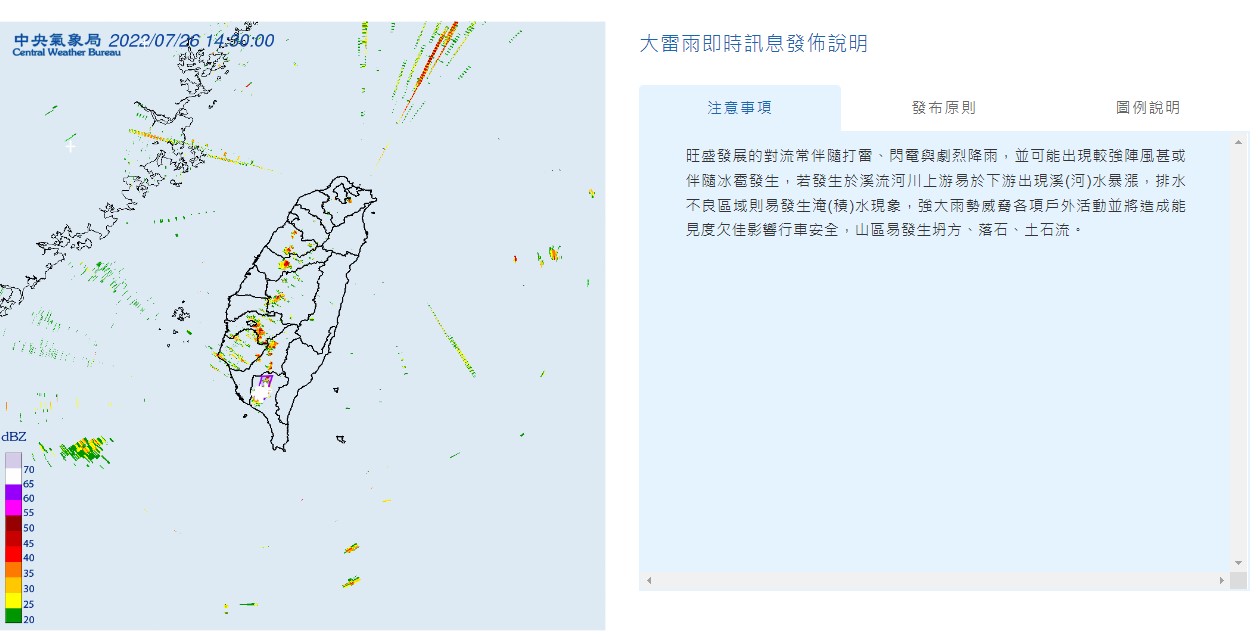 另外,氣象局也針對屏東縣發布大雷雨即時訊息,持續時間至16時00分止。氣象局提醒,旺盛發展的對流常伴隨打雷、閃電與劇烈降雨,並可能出現較強陣風甚或伴隨冰雹發生,若發生於溪流河川上游易於下游出現溪(河)水暴漲,排水不良區域則易發生淹(積)水現象,強大雨勢威脅各項戶外活動並將造成能見度欠佳影響行車安全,山區易發生坍方、落石、土石流。