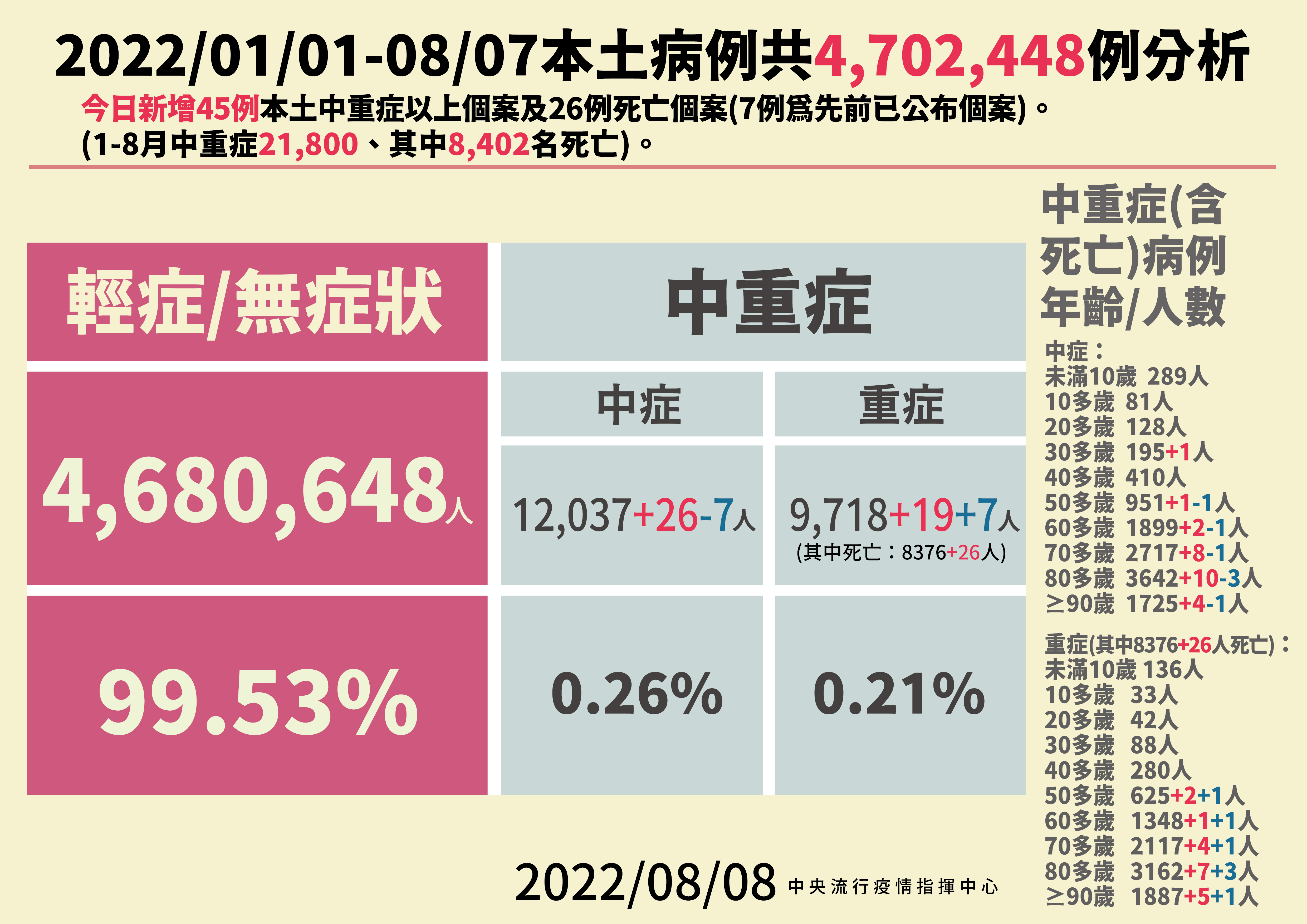 指揮中心指出,國際上Omicron亞型變異株BA.4及BA.5分別於今年1月及2月首次於南非發現,研究顯示該二株病毒株均有傳染力較高及免疫逃脫特性,具社區傳播能力;世界衛生組織(WHO)於8月3日資料指出,BA.5變異株現為全球主流株,佔比約為70%,BA.4變異株佔比約為12%,迄今至少100個國家通報 BA.5變異株感染病例,已於歐美及日、韓、紐、澳等多國廣泛傳播,造成病例、住院及重症數增加,鄰近新加坡、中國大陸、香港、泰國、印尼及越南等亦均報告BA.5變異株本土疫情。依現有研究顯示,已接種3劑mRNA疫苗成人且曾感染Omicron其他亞型變異株者,對BA.5變異株仍具9成保護力,另BA.5變異株感染者整體住院風險低。