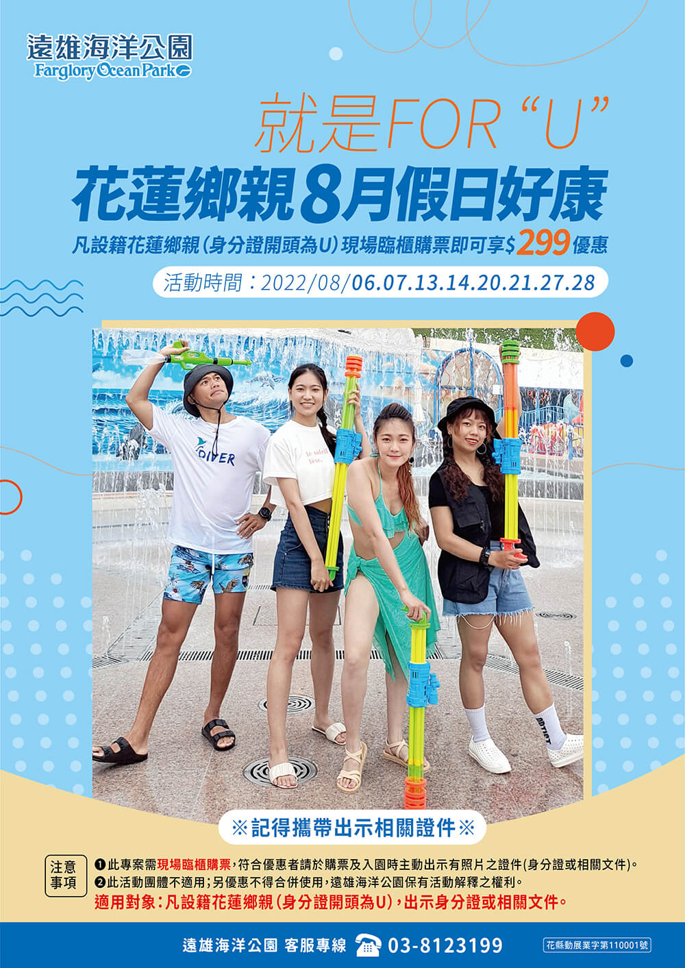 花蓮鄉親有福了!只要身分證有「U」,於8月的每個周末(8/6、8/7、8/13、8/14、8/20、8/21、8/27、8/28),現場臨櫃購票即可享$299優惠。