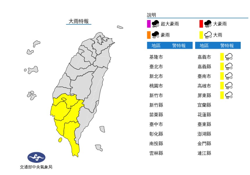 ▼5縣市發布大雨特報。(圖/中央氣象局)