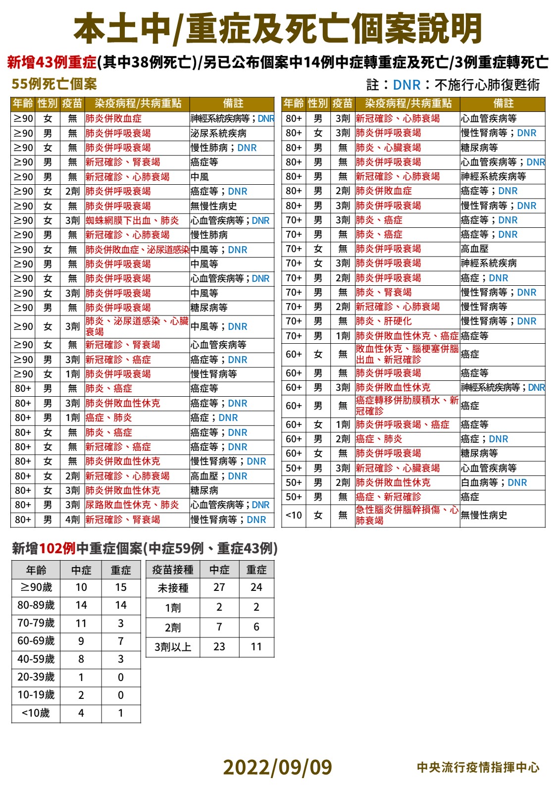 指揮中心指出,今日新增55例本土病例死亡個案,為32例男性、23例女性,年齡介於未滿10歲至90多歲以上,皆屬重度感染、53例具慢性病史、40例未接種3劑以上COVID-19疫苗。確診日介於今(2022)年5月17日至9月6日,死亡日期介於8月13日至9月6日。