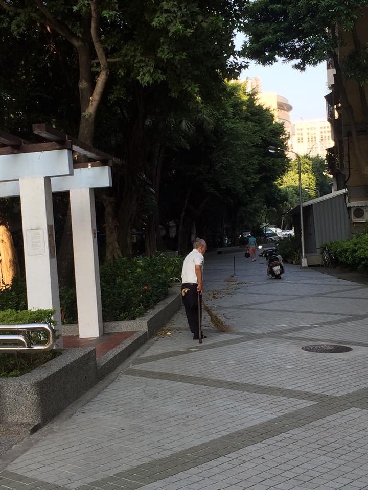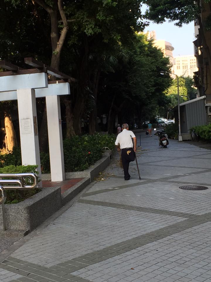 這位老先生單腳支撐身體,手拿掃把,很認真掃掉地上樹葉,他每日默默行善,沒有人知道他是誰?這才是我台灣社會最需要的正能量!
