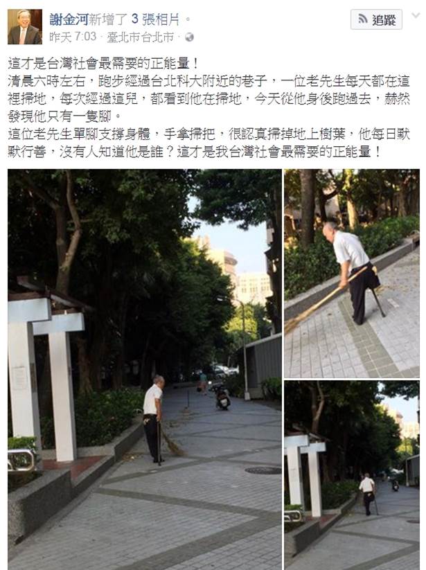 謝金河表示,他每天清晨六時左右會去跑步,途中會經過台北科大附近的巷子,他發現在這裡每天都有一位老先生在這裡掃地,那天他從老伯的身後跑過去時,突然發現「他只有一隻腳」,他在臉書描寫道「老先生