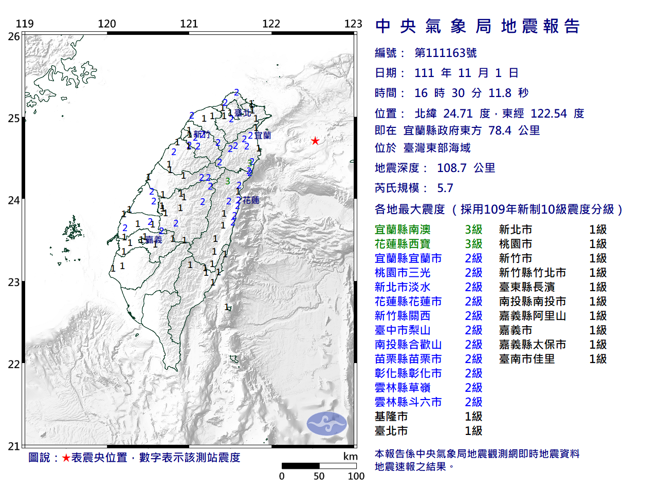 中央氣象局發布顯著有感地震最新消息,今日16時30分,發生芮氏規模5.7有感地震,震央位置在宜蘭縣政府東方 78.4 公里 (位於臺灣東部海域),震源深度108.7公里。