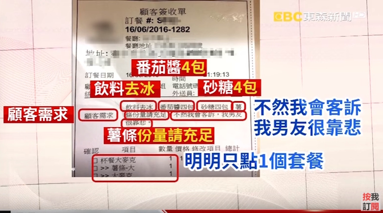 奧客」,日前也有網友爆料,一名徐小姐向速食店訂餐外送,要求「飲料去冰、番茄醬4包、砂糖4包、薯條份量請充足,不然就會客訴」,還硬拖男友下水,是他愛抱怨,而這落落長的需求,仔細看,明明就只點了一個漢堡套餐,多數民眾都覺得這樣的要求實在太誇張。