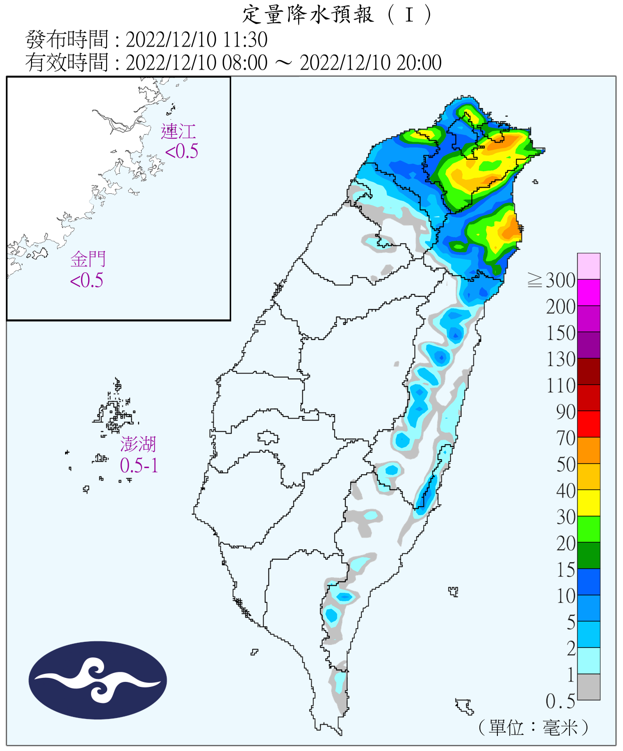 今(10)日受到東北季風影響,北部及東北部天氣濕涼,其他地方早晚也涼;迎風面水氣多,北部及東北部容易下雨,尤其基隆北海岸、宜蘭地區及大臺北山區雨勢持續,有局部大雨發生的機率,而且東北季風還會延續到下周,出現兩段式降溫,低溫有機會到13度。