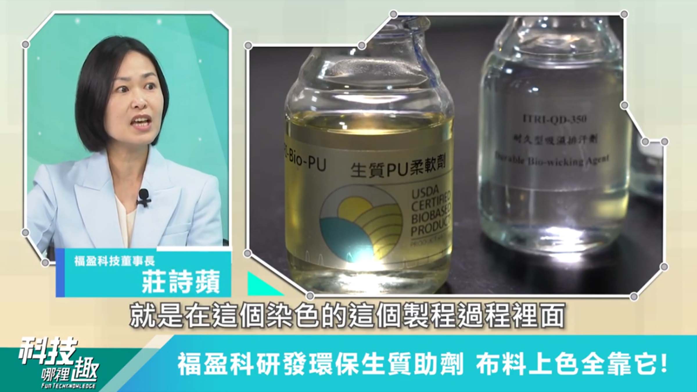 ▼福盈科技董事長莊詩萍揭密「生質染色助劑」是把顏色黏上布料的大功臣。(圖/工研院提供)