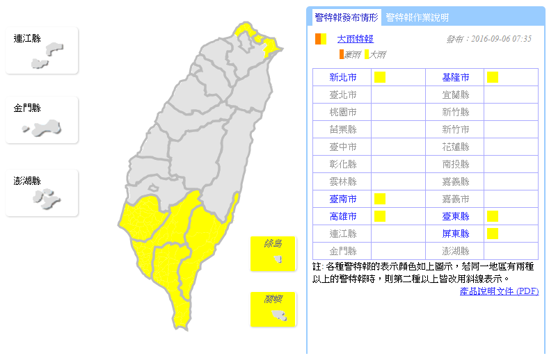 另外,今天因為低壓帶往北移動的關係,把昨天在巴士海峽的水氣也到台灣上空,所以全台各地天氣不穩定,尤其嘉義以南及台東、北部及東北部地區,整天會有一陣一陣的降雨發生,中午過後,更會有局部大雨和豪雨發生的機會,所以中央氣象局就針對了基隆市、新北市、台南市、高雄市、台東縣、屏東縣以上6縣市發布大雨特報,請民眾外出務必攜帶雨具,並隨時留意天氣狀況。