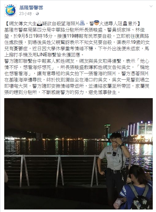 隨著網路科技越來越發達,朋友之間的聯繫也變得更加方便,但卻沒有因此拉近人與人之間的距離,反而讓人際關係越來越疏離,很多人都會上網抒發情緒,若是能多一點關心或許就能阻止憾事發生,網路也可以成為救人的工具。本月5日一名基隆