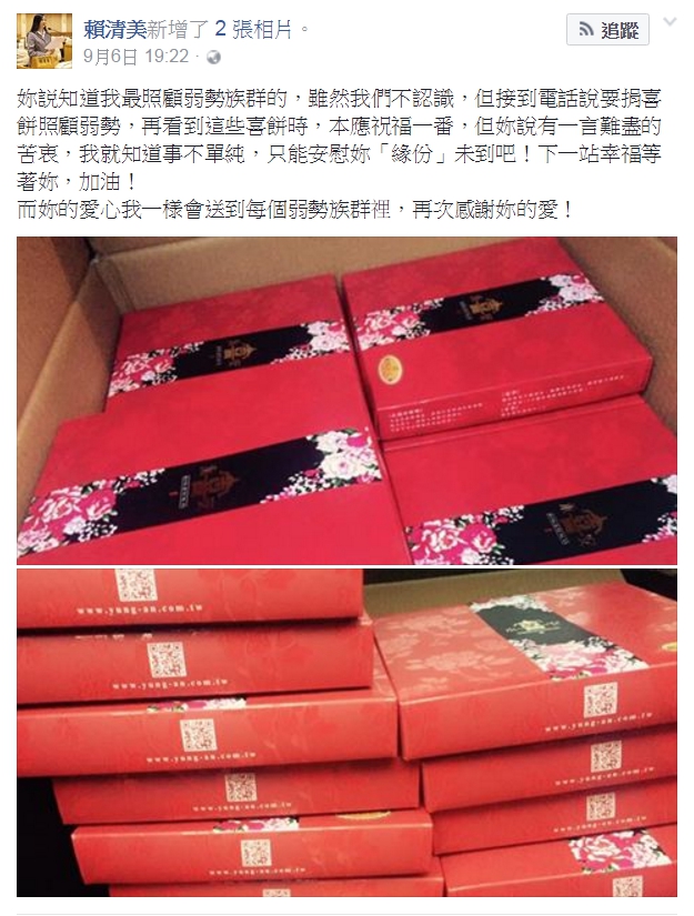 ▼賴清美將喜餅轉送到弱勢戶手中(圖/截自賴清美臉書)