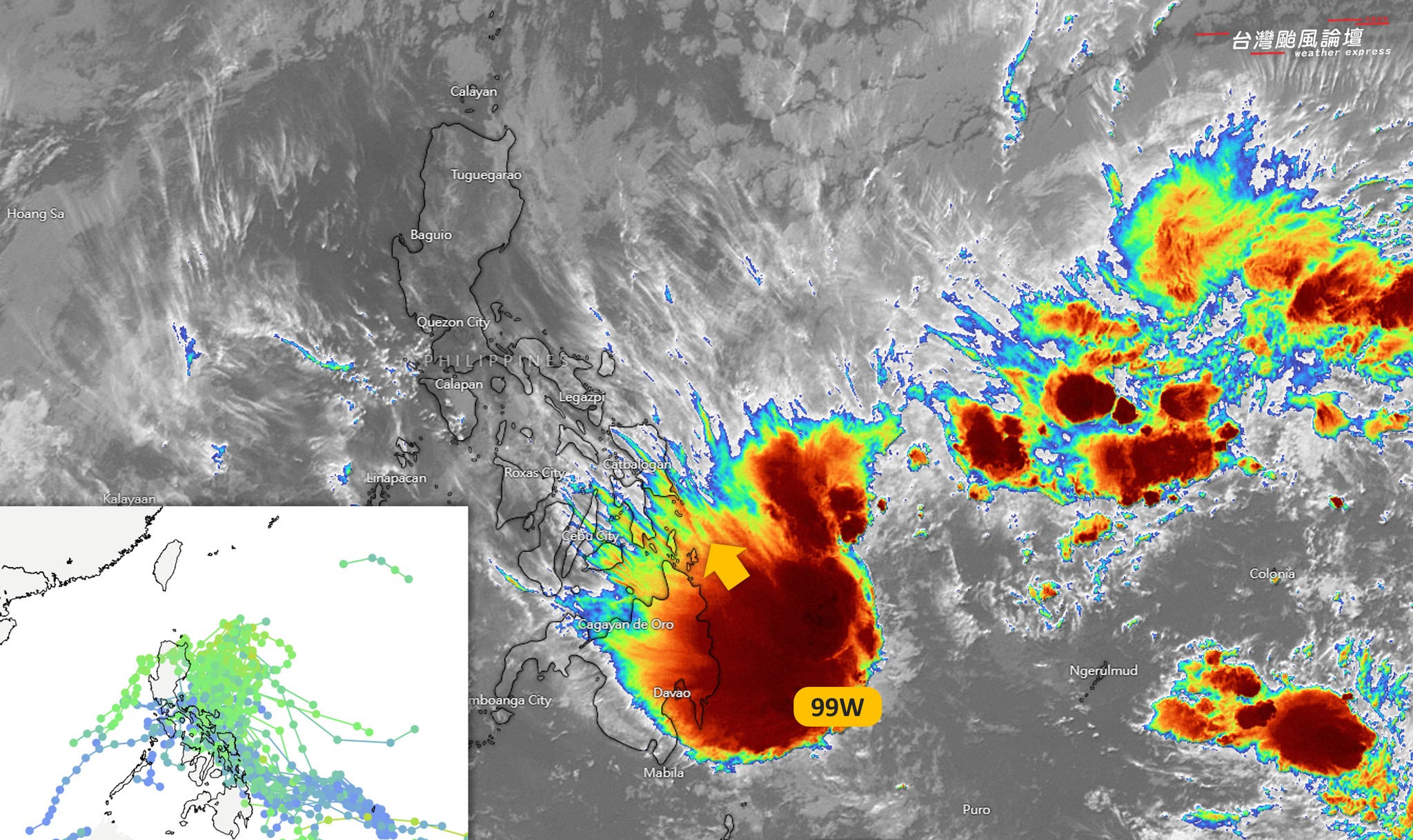 該模式預估,99W明後天沿著菲律賓東岸移動,下周一抵達菲律賓東北角後,再轉向東北,會造成以東部、北部為主的降雨。此外,另一個觀察重點是99W北上過程中,會遇到東北季風增強、冷空氣南下,所幸99W位置偏東就北轉,帶來的水氣會少許多,因此迎風面地區出現劇烈雨勢或發生共伴效應的機率也會降低許多。