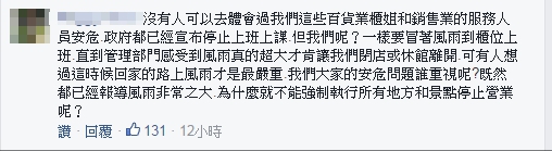 不少網友擁入陳菊臉書留言表示「讚啦!」、「謝謝花媽」,但是也有不少人問「那麼服務業是否也同樣享有同樣條款呢?」,就有百貨公司員工抱怨指出,政府都已經宣布停止上班上課,但他們一樣要冒著風雨到櫃位上班,直到管理部門感受到風雨真的超大才肯讓我們閉店或休館離開,讓人不禁想問「安危問題誰重視呢?」還有人表示,公司依法放颱風假,但卻要被扣1天薪水,上次已經扣1天了,這次又要被扣,真的很無奈。