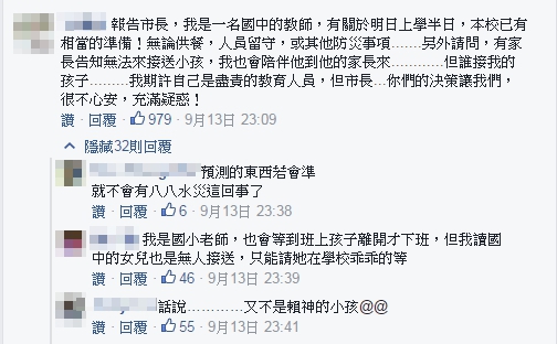 還有國中老師留言表示,對於上半天課的措施,校方已有萬全準備,老師們也都會等家長接完孩子才離開,「但誰接我的孩子,我期許自己是盡責的教育人員,但市長…你們的決策讓我們,很不心安,充滿疑惑!」