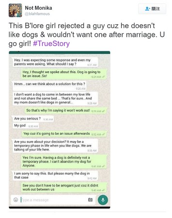 印度一名女子因為未婚夫不喜歡她養的愛犬,要求婚後搬出兩人生活,雙方為此溝通了一段時間,卻依然沒有共識。這名女子後來在社群媒體上貼出兩人對話,表示不會為了任何人拋棄愛犬,而男子也氣得放話,「那妳就嫁給狗吧」。最後女方不顧家人的反對,毅然推掉這門婚事!
