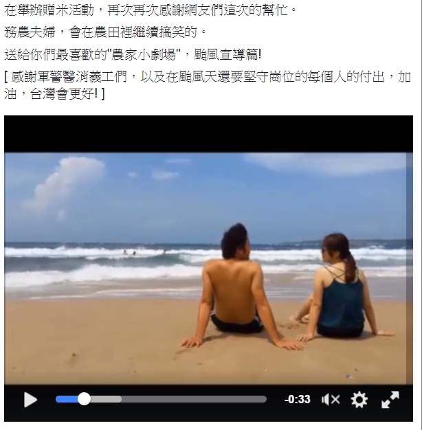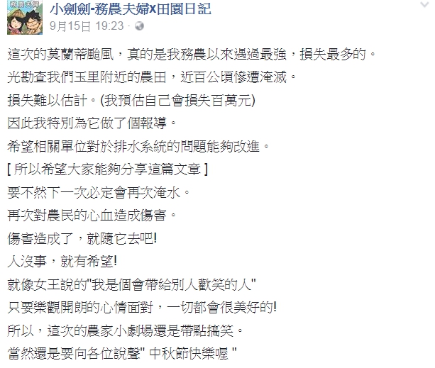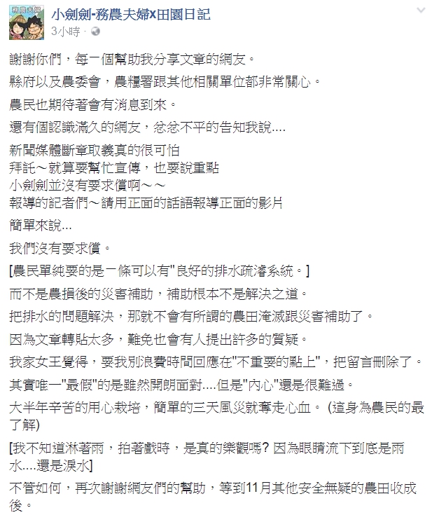 另外,「小劍劍-務農夫婦ⅹ田園日記」在15號po出農損影片引起大家的關注,今天再po文對大家的關心表達感激,感謝颱風天要堅守崗位的每個人,同時也對有人質疑影片是為了想要求償的說法做出回應,表示「我們沒有要求償。農民單純要的是ㄧ條可以有良好的排水疏濬系統,而不是農損後的災害補助,補助根本不是解決之道。把排水的問題解決,那就不會有所謂的農田淹滅跟災害補助了」。另外也表示會繼續在田裡搞笑,送給大家最喜歡的「農家小劇場」,希望台灣會更好!