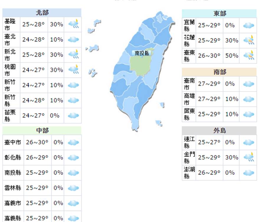 中央氣象局指出,東北季風南下,全台都會受到影響,新竹以北影響較大,中南部則沒有那麼明顯。由於冷暖空氣交界大致就位於台灣附近,接下來這幾天台灣天氣都處於不穩定狀態,北部、東北部地區溫度約24~31度,早晚偏涼;而中南部較不受冷空氣影響,溫度約維持在26到32度。