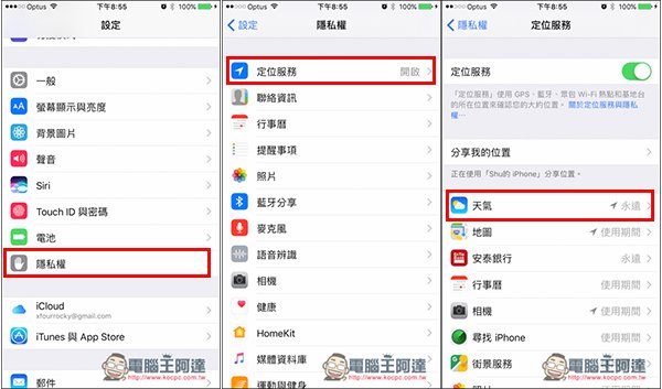 進到設定中的隱私權,打開定位服務,即可看到所有 Apps 取用你位置的狀態。