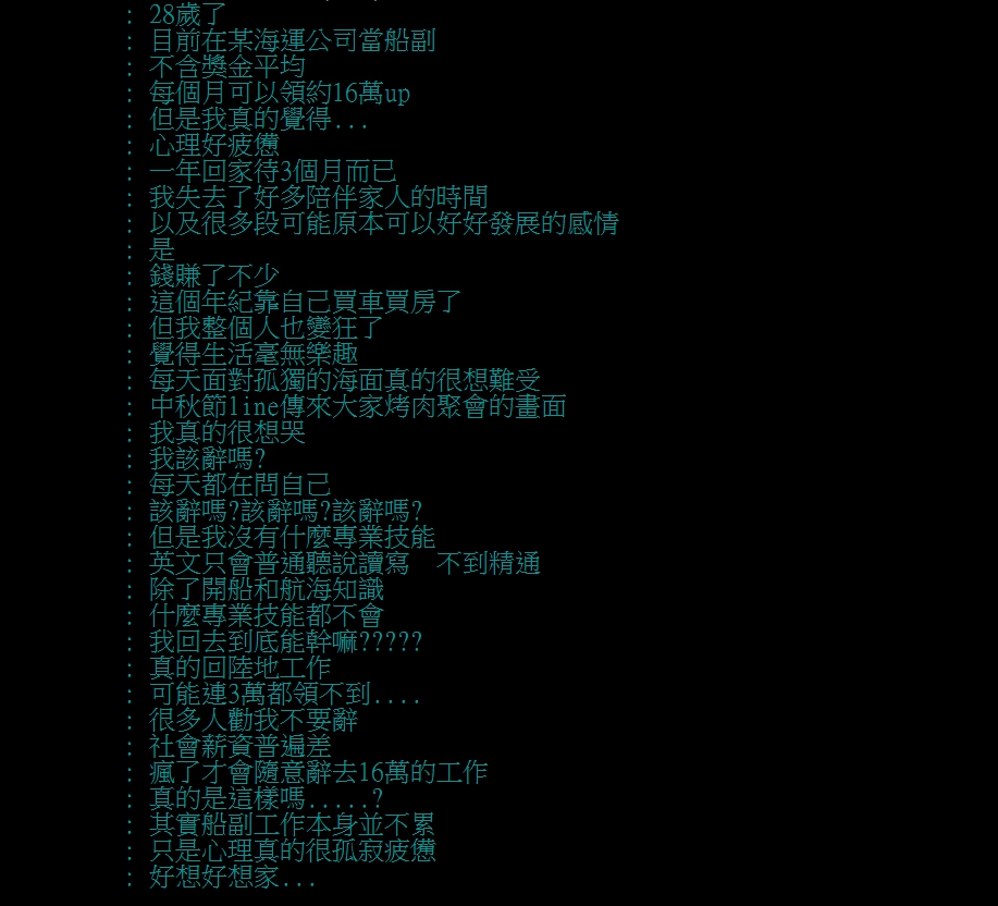他承認這個工作確實為他賺進不少錢,年紀輕輕就已經可以靠自己買車買房,但這種生活也讓他變狂,開始覺得生活毫無樂趣,他每天都在問自己「該辭掉這個工作嗎?」,覺得每天面對孤獨的海面真的很難受,中秋節的時候,line傳來大家烤肉聚會畫面,讓他更加難受,但是他又害怕萬一辭掉工作,除了開船和航海知識什麼都不會的他,回到陸地上會不知道要幹嘛,甚至可能連3萬都領不到,各種現實的考量讓他陷入天人交戰。