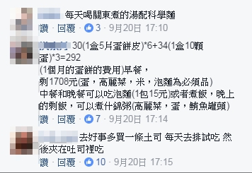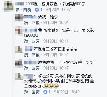 對現代人來說,除非省到不行,餐餐粗茶淡飯,一餐以50元計算,一天就要150元,遠遠超過月花2000元的扣打。不過有不少網友看到這樣生活類的問題,都熱情地提供「建議」。包含「可以天天喝關東煮的湯配科學麵」、「餐餐30元三明治」、「泡麵一碗23元,一天3碗一個月90碗=2070元,如果沒有70就帶著泡麵碗去街上坐一下應該有」、「買包米自己煮天天一顆荷包蛋又營養」、「請參閱《黃金傳說》」。