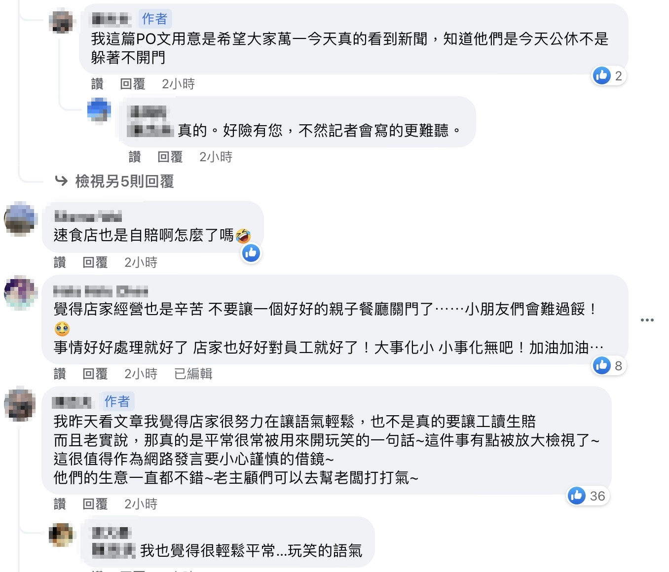 原PO留言表示,自己認為店家昨日很努力想要讓語氣輕鬆,「也不是真的要讓工讀生賠」,認為一句玩笑話被一些人過度放大,但也顯示網路發言謹慎的重要性,最後希望大家能多點正向發言。其他網友也認為店家經營辛苦,希望不要因此影響生意而關門,不過仍有網友依舊不領情,引發雙方論戰。
