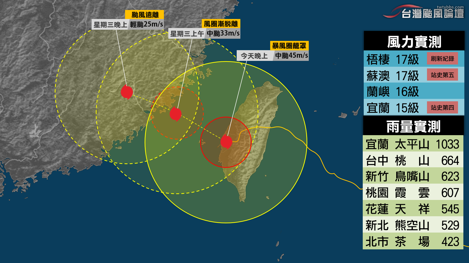 ▼颱風出海後,風勢雨勢仍不容小覷。(圖/翻攝自台灣颱風論壇)