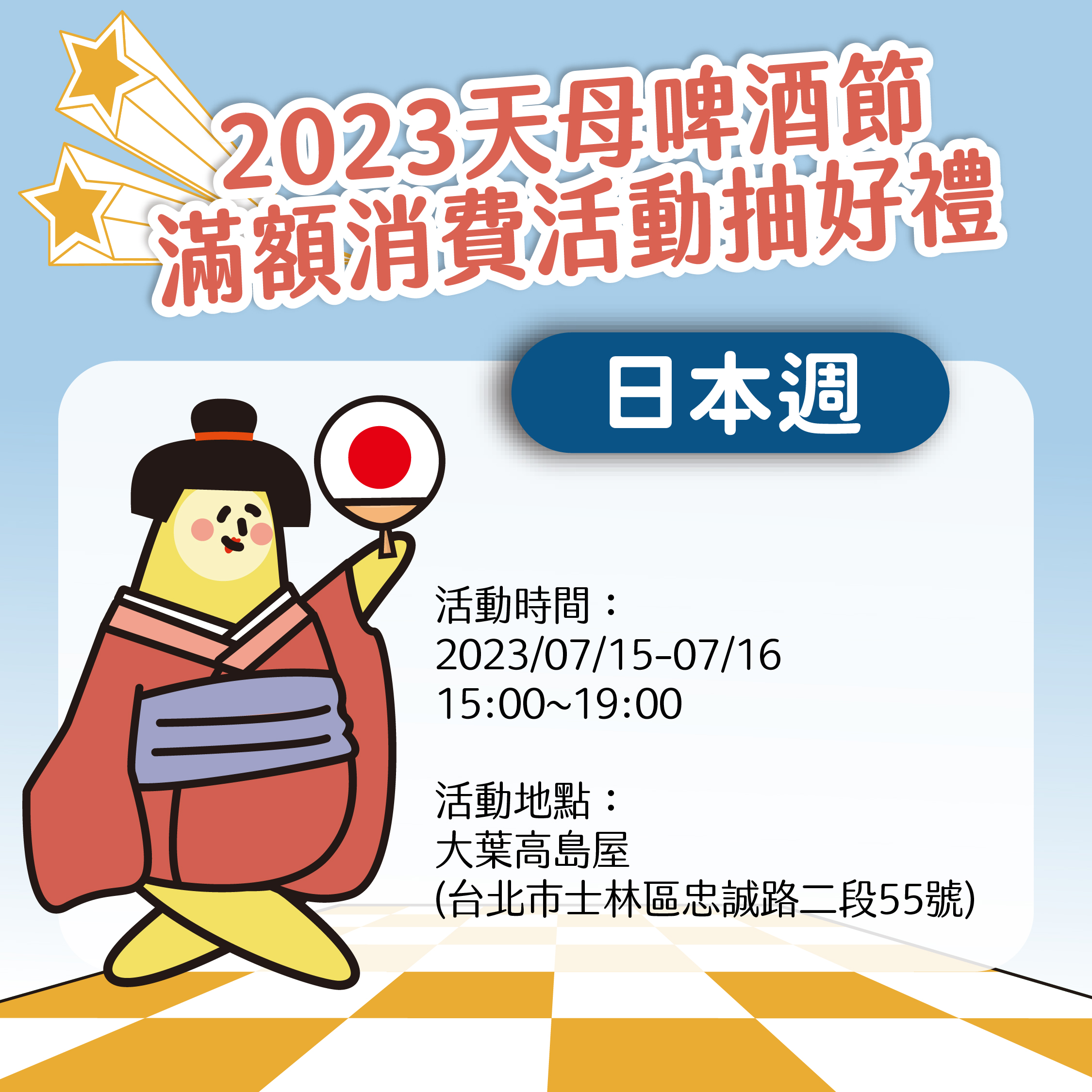 本次活動力邀超過100間天母店家合作,包含全台首間取得『拿坡里披薩協會』認證的披薩店「OGGI 歐奇窯烤披薩」、連續四年獲得米其林推薦台菜「女娘的店」、日系復古咖啡廳「富玉洋行」、樂高迷最愛的「BRICK PAPA 樂高積木專賣店」等特色店家,自112年6月22日至7月23日,加入天母商圈官方LINE帳號,除享受店家專屬優惠外,還有滿額消費抽獎活動,於特約店家單筆消費滿200元可獲得抽獎券1張,更祭出雙人韓國來回機票、GOGORO VIVA KEYLESS、iPhone 14 128G、PS5、Nintendo Switch等多項精采大獎等你來抽,要讓大家好禮拿不完!