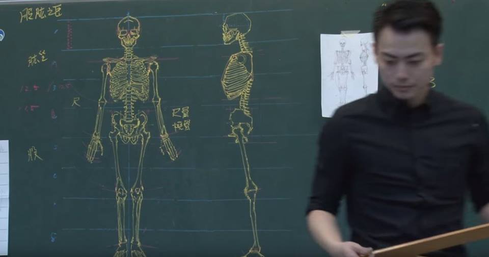 另外還有一位視覺設計的講師鍾全斌,只需要用幾根粉筆跟尺,就能在黑板上畫出超寫實的「人體骨骼圖」,細緻到連肌肉都能畫得栩栩如生。