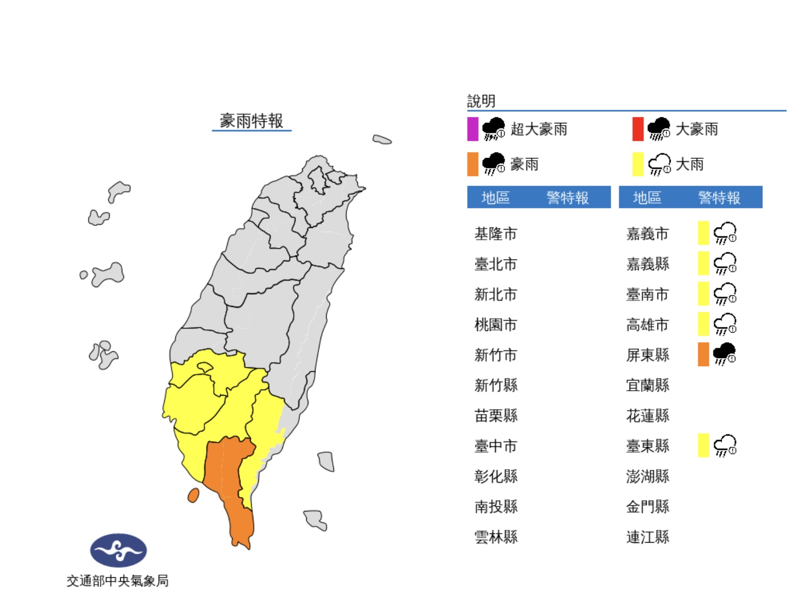 ▼迎風面的南部6縣市發布豪、大雨特報。(圖/中央氣象局)