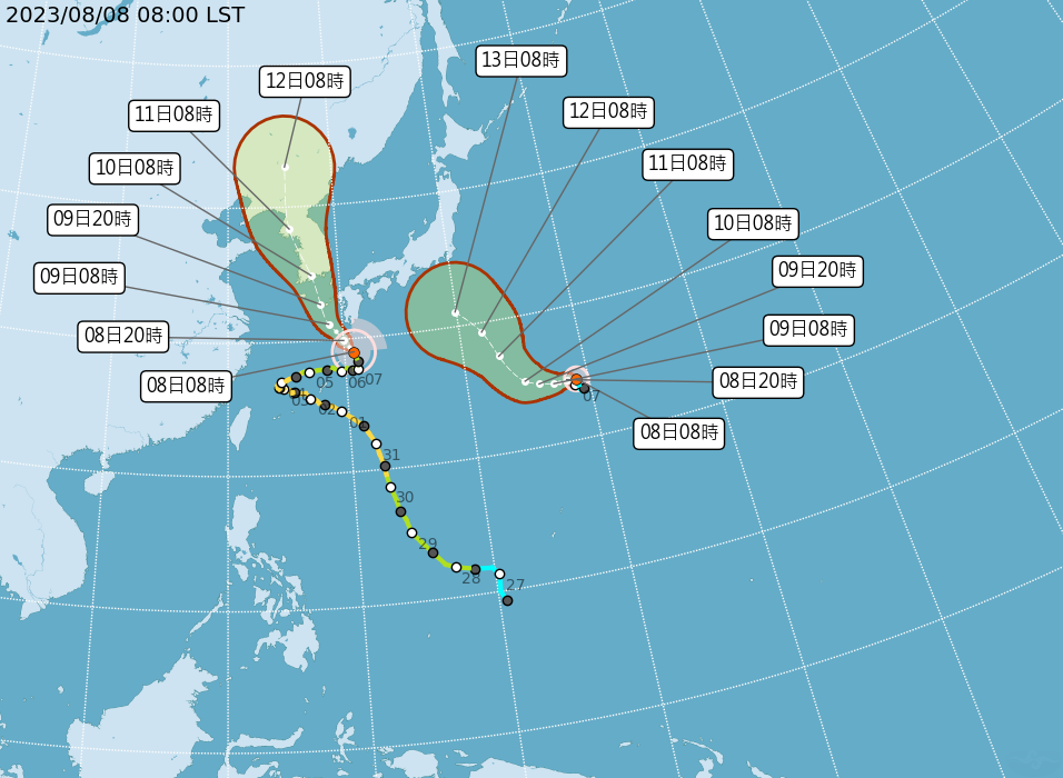 卡努颱風遠離台灣後,使台灣處在西南風環境,今(8)日水氣有增加趨勢。未來天氣持續受西南風及低壓影響,迎風面中南部一整天有斷斷續續短暫雨或雷雨;北部、東半部則因熱對流雷雨發展旺盛,局部會出現大雷雨,且在溫度方面,高溫將下降至30-33度之間。